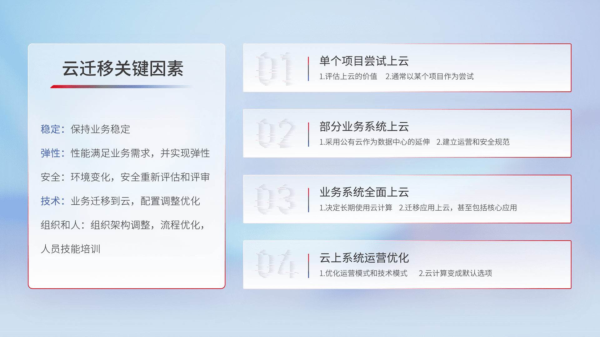 结合实际业务,,,从规划设计、、、云平台选型、、、云原生改造、、、、数据迁移、、、、集成交付,,,迁移全过程为客户识别最佳上云路径,,,做好风险识别管理,,,,设计网络架构、、、、身份权限、、、安全审计合规、、操作审计、、、、日志审计、、、、监控告警策略、、、、多站点容灾设计等,,,,对云上基础设施进行整体规划,,,,提升IT治理水平,,,,以满足弹性、、、、高可用、、、、高性能的需求。。。