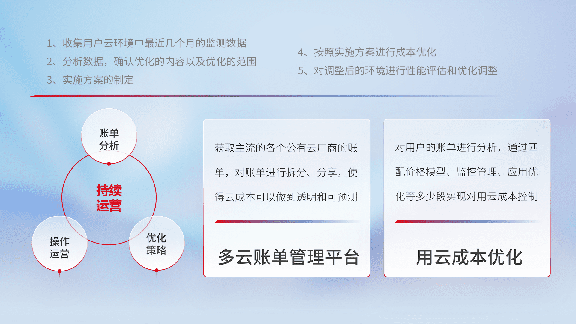 通过多云纳管,,,以统一的资源数据模型把客户的云资源进行抽象和封装,,进而实现对多云资源的统一操作,,保障云资源管理的可靠性、、、稳定性与可用性。。量身定制化运维内容,,,配置、、、、开发运维、、、、补丁管理、、、备份、、、监控、、、、认证和访问管理、、审计和日常巡检等,,,,保障在用云过程中的可靠度,,,,稳定度以及高可用率。。