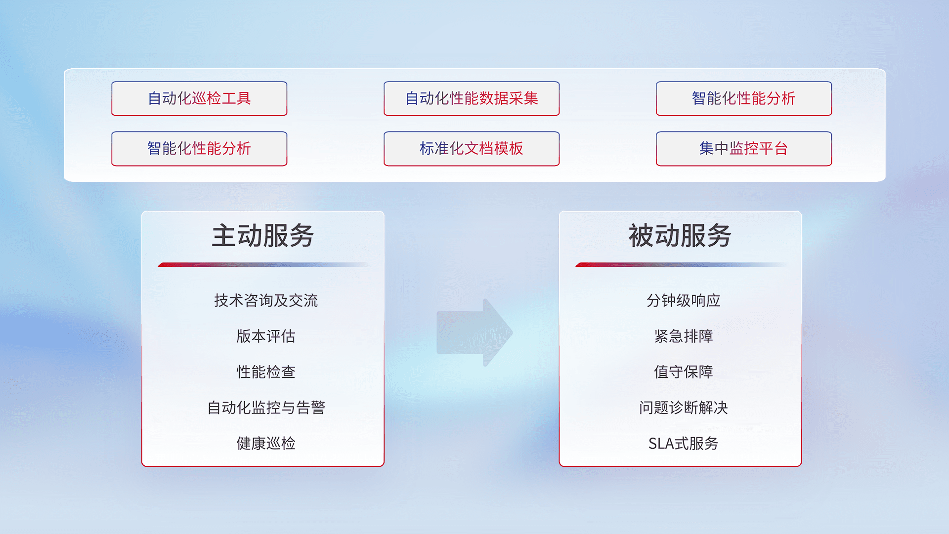智能化工具和标准化文档,,,保障服务质量,,,,提供主动服务(包含技术咨询、、版本评估、、性能检查、、自动化监控与告警、、健康巡检)和被动服务包含(分钟级响应、、、、紧急排障、、值守保障、、问题诊断解决、、、SLA服务)。。